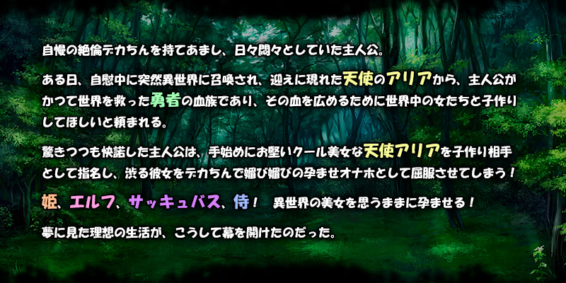 姫、天使、侍、エルフ、サキュバスなど国や種族のトップの乳も顔も地位も全て揃ったメスたちとひたすら孕ませ交尾!交尾しているだけで徹底的に媚びて尽くされ仕えられるハーレム生活を!