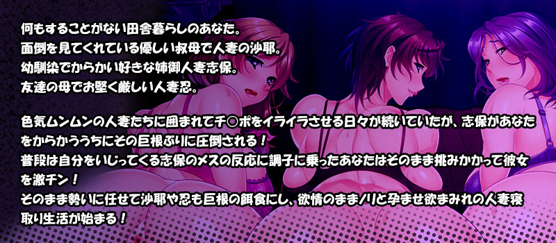 個性豊かな3人の人妻をあなただけのハメ妻にして、ヤりたい放題のハーレム性活!爆乳デカ尻を楽しむはもちろん人妻たちそれぞれの奉仕や日常的なメス媚びをたっぷり楽しめます!